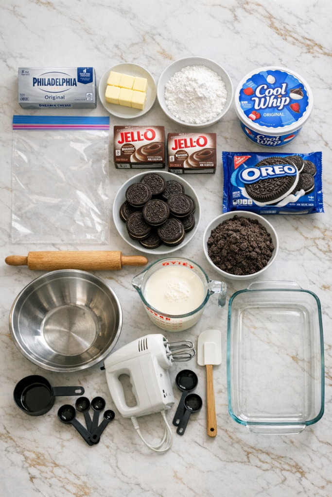 Top Layer: Sprinkle the remaining crushed Oreos over the top, covering the entire surface.