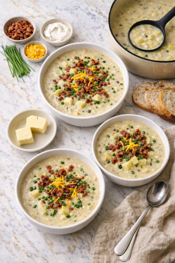 My soup turned out too thick. What do I do? Add warm broth or water, one splash at a time, stirring between each addition until you reach your preferred consistency. This is normal — potatoes continue to absorb liquid as the soup cools.