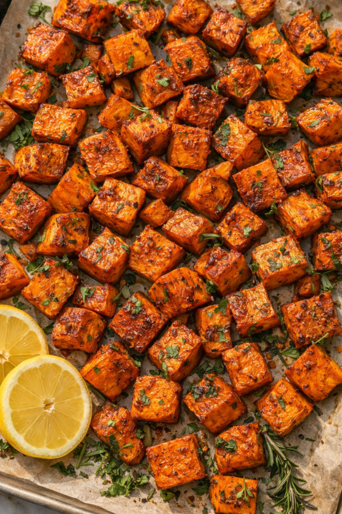 Spread the sweet potatoes in a single layer on your prepared baking sheet.
